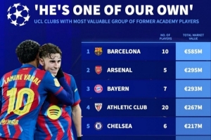 體育資訊1月20日訊 德國轉會市場統(tǒng)計了歐冠俱樂部之中自家青訓球員的身價,并列出榜單,巴薩居首,阿森納、拜仁前三。