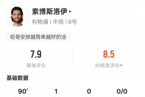 體育資訊1月22日訊 歐冠聯(lián)賽階段第7輪,利物浦3-0戰(zhàn)勝馬賽。索博斯洛伊首發(fā)出戰(zhàn),打進1粒進球,送出1次關鍵傳球,還有3次解圍,評分7.9。