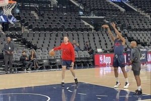 據(jù)快船隨隊記者Tomer Azarly報道,快船倫納德賽前來到了場上進行熱身。