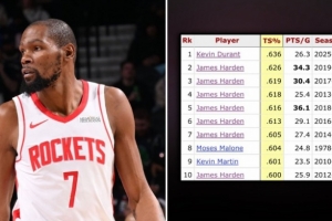本場比賽過后,杜蘭特場均26.3分,真實命中率63.6%,創(chuàng)火箭隊史場均20+球員中真實命中率歷史新高。