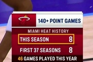 據(jù)統(tǒng)計(jì),熱火本賽季8次單場(chǎng)140+,而隊(duì)史此前37個(gè)賽季合計(jì)8次。