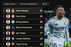 體育資訊1月25日訊 在本輪西甲,皇馬2-0擊敗比利亞雷亞爾,姆巴佩梅開二度。以下為五大聯(lián)賽球員在本賽季各項(xiàng)賽事總進(jìn)球榜,姆巴佩與凱恩均打進(jìn)34球,具體如下: