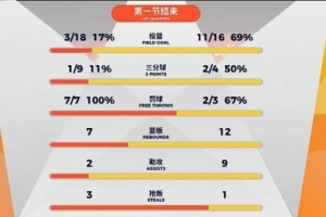 首節(jié)比賽,山東全隊(duì)進(jìn)攻端毫無(wú)狀態(tài),內(nèi)外線都不在線,各種打鐵頻出,命中率低到離譜:投籃18投僅3中,三分更是僅9中1。