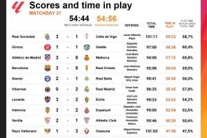體育資訊1月27日訊 數(shù)據(jù)顯示,西甲第21輪沒有任何一場比賽的凈時(shí)間超過了60分鐘,平均凈時(shí)間為54分44秒。