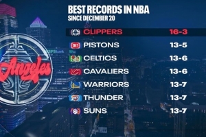 快船戰(zhàn)勝爵士,轉(zhuǎn)播方曬出12月20日(當(dāng)?shù)貢r間)以來聯(lián)盟戰(zhàn)績前七的球隊(duì),快船高居第一: