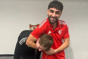 隨后,他又發(fā)了一張照片,照片里他用胳膊夾住了塞維利亞媒體團(tuán)隊(duì)的一名成員的脖子。他為這張照片配文:“女士們先生們,我們抓到他了?!?/p>