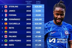 體育資訊1月29日訊 德轉(zhuǎn)統(tǒng)計切爾西隊內(nèi)的年薪排行,剛剛官宣離隊的斯特林此前年薪1950萬歐排名隊內(nèi)第一,里斯·詹姆斯、福法納排名前三。