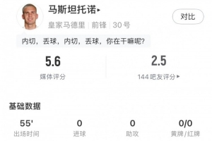 體育資訊1月29日訊 歐冠聯(lián)賽階段第8輪,皇馬客戰(zhàn)本菲卡,馬斯坦托諾代表皇馬首發(fā)出戰(zhàn),在下半場第55分鐘被換下,球員此役數(shù)據(jù)如下: