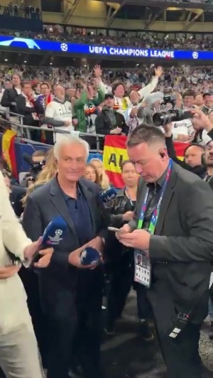 體育資訊01月29日訊 本菲卡4-2皇馬賽后,穆里尼奧接受場(chǎng)邊采訪時(shí),一旁的皇馬球迷高唱穆里尼奧之歌。