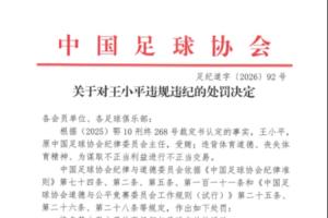 體育資訊01月29日訊 中國足協(xié)公布足球行業(yè)“假賭黑”處罰決定,原中國足球協(xié)會紀律委員會主任王小平受賄,進行不正當交易,終身禁止從事任何與足球有關(guān)的活動。
