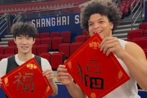賽前,上海球員偰李永煒和外援洛夫頓用毛筆寫福字。賽季至今,上海16勝4負(fù)位列聯(lián)賽第三位。