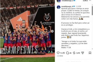 體育資訊1月13日訊 巴薩后衛(wèi)阿勞霍更新社媒動態(tài),談到了復出并隨隊贏得西超杯的感受。