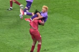 兩名球員在球場(chǎng)邊突然上演摔跤比賽,雙方更是使出WWE摔跤動(dòng)作,只見(jiàn)一方用“奪命剪刀腳”撂倒另一方,最后更是有球員上來(lái)扮演裁判為他們拍地板讀秒!