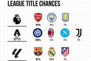 體育資訊02月03日訊 根據(jù)EuroClubIndex的預(yù)測數(shù)據(jù),五大聯(lián)賽最新奪冠概率如下。