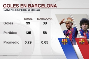 據(jù)ESPN統(tǒng)計,18歲亞馬爾已經(jīng)為巴薩打進39球,巴薩生涯進球數(shù)量超越馬拉多納(38球)。