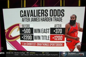 目前,騎士的冠軍賠率是1:1200,和尼克斯并列第三。
