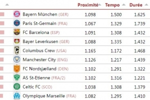 排名第一的拜仁獲得了100分的綜合評分(即其他球隊以拜仁的100分作為綜合指標),巴黎、巴薩作為二、三名分獲98.9和98.6分。