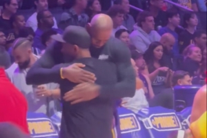 本場(chǎng)比賽,黑人影帝丹澤爾·華盛頓來到現(xiàn)場(chǎng)看球,他還來到詹姆斯身邊,兩人擁抱并寒暄數(shù)句。