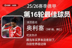 第16輪評選結果出爐,拜仁前鋒奧利塞2射1傳,助球隊8-1狂勝沃爾夫斯堡,奧利塞獲得超過25000名吧友的支持,當選【體育資訊X小紅書德甲第16輪最佳球員】!