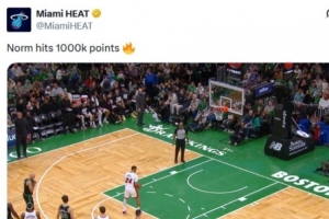 比賽進(jìn)行到第二節(jié),鮑威爾通過(guò)罰球得到熱火生涯第1000分,熱火官方推特隨后發(fā)文祝賀,卻不慎鬧出烏龍——將“1000分”誤寫成了“100萬(wàn)分”??。