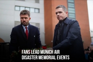 在德國(guó),曼徹斯特慕尼黑紀(jì)念基金會(huì)的代表們?cè)谀侥岷诼鼜厮固貜V場(chǎng)紀(jì)念碑前主持悼念儀式,球迷事務(wù)總監(jiān)里克·麥加格與前球員亞歷克斯·斯特普尼共同出席。