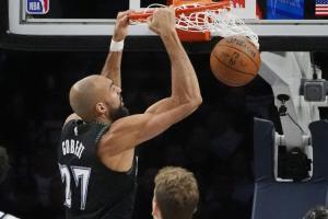 此役,戈貝爾出戰(zhàn)33分鐘,投籃12中5,罰球4中2,得到12分16籃板2助攻3搶斷2蓋帽,包括7進攻板。