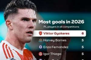 體育資訊2月8日訊 在本輪英超,阿森納3-0擊敗桑德蘭,約克雷斯梅開二度。以下為英超球員在2026年各項(xiàng)賽事進(jìn)球榜,其中約克雷斯居首。