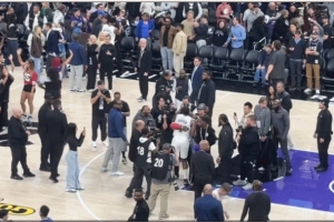 賽后,哈登被媒體記者們包圍,他和自己的幾個(gè)朋友擁抱致意。