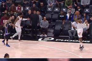 終場前2分多鐘,騎士反擊,米切爾回傳助攻哈登命中空位三分反超比分。在哈登投進這球之前,米切爾已經提前慶祝了。