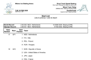體育資訊2月9日訊 2026米蘭冬奧會短道速滑混合接力四分之一決賽分組確認(rèn),中國和加拿大、比利時(shí)、哈薩克斯坦一同分在第三組。