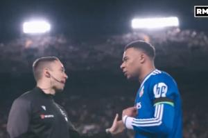 DAZN攝像機(jī)拍到姆巴佩上半場(chǎng)結(jié)束后與第四官員溝通。