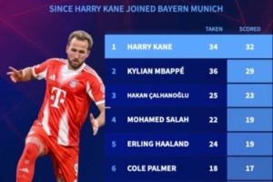 德轉(zhuǎn)數(shù)據(jù)統(tǒng)計(jì)顯示,凱恩自加盟拜仁后打進(jìn)32粒點(diǎn)球是同期最多。