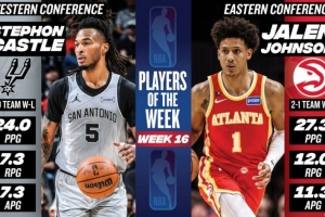 體育資訊2月10日訊 今日NBA官方宣布,馬刺后衛(wèi)斯蒂芬·卡斯?fàn)柡屠销椙颁h杰倫·約翰遜分別被評本賽季第16周西部和東部周最佳球員。