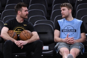 勇士主場(chǎng)迎戰(zhàn)灰熊,賽前斯潘塞兄弟合影留念。