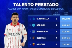 體育資訊2月10日訊 德國轉(zhuǎn)會(huì)市場統(tǒng)計(jì)了各俱樂部租借加盟球員的身價(jià),并列出榜單,馬賽居首,那不勒斯、漢堡二三位。
