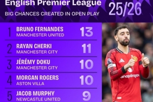 體育資訊2月10日訊 squawka統(tǒng)計了本賽季英超球員在運動戰(zhàn)創(chuàng)造重大機會情況,曼聯(lián)隊長B費依然領(lǐng)跑。