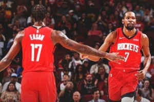 賽后火箭官方發(fā)布贏球海報(bào),杜蘭特和伊森擊掌瞬間成為封面。
