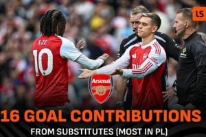 本賽季,阿森納替補球員在英超參與了16個進球,在聯(lián)賽排名第一,而曼城的替補球員只參與2個進球,聯(lián)賽最少。
