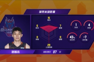 ??1月9日,常規(guī)賽第12輪,山東高速客場(chǎng)87-85戰(zhàn)勝北京北汽,收獲5連勝。本場(chǎng)比賽山東高速隊(duì)高詩(shī)巖因傷缺陣,后衛(wèi)線上珀賽爾和謝智杰站了出來(lái),珀賽爾在最后時(shí)刻完成絕殺,謝智杰登場(chǎng)29分11秒,貢獻(xiàn)15分7籃板6助攻。這是謝智杰職業(yè)生涯首次打出15+5+5的表現(xiàn)。