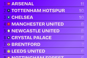 體育資訊2月13日訊 Squawka統(tǒng)計了本賽季各隊在英超比賽中的頭球進球數(shù)量,并列出榜單,阿森納11球最多,熱刺、切爾西10球次席。