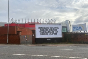 在老特拉福德外,有一個(gè)橫幅這樣寫道:移民對(duì)這座城市的貢獻(xiàn)遠(yuǎn)超那些逃稅的億萬(wàn)富翁。