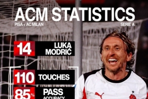 體育資訊2月14日訊 意甲第25輪比賽,莫德里奇破門,米蘭客場2-1擊敗比薩,米蘭官方社媒曬出莫德里奇本場比賽的數(shù)據(jù),配文:“大師風(fēng)范?!?/p>