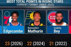 埃奇庫(kù)姆合計(jì)得到23分,自全明星新秀賽新模式以來(lái)(2022年)第二高,僅次于2023年的格萊姆斯。