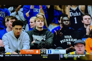 因腳部中足扭傷而缺席了全明星新秀賽的弗拉格回到杜克大學(xué)觀戰(zhàn)。