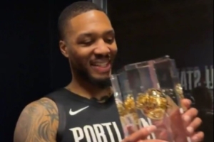 賽后,利拉德在后臺和字母哥分享自己的獎杯,字母哥說道:“只有其他兩名球員贏得過三次三分大賽冠軍?!?/p>