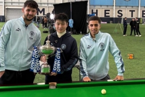 新科世界冠軍趙心童受俱樂部邀請,在阿提哈德球場觀看了曼城對陣?yán)瘴謳焐臍W冠比賽,次日又前往球隊訓(xùn)練基地參與內(nèi)容拍攝活動。趙心童在綠茵般的臺呢上向后衛(wèi)劉易斯和門將特拉福德展示了斯諾克技藝。