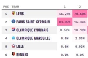 但根據opta的預測,巴黎奪冠的概率仍然高達83.09%,朗斯奪冠概率僅有16.24%。巴黎是五大聯(lián)賽僅有排名不是榜首(比賽輪次相同),奪冠概率卻是第一的球隊。