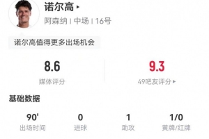 體育資訊2月16日訊 阿森納在本輪足總杯4-0大勝維岡競技,諾爾高本場數(shù)據(jù)如下: