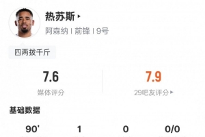 體育資訊2月16日訊 足總杯第4輪,阿森納4-0維岡競技。熱蘇斯首發(fā)出戰(zhàn),1射門1射正打進1粒進球,另外他還有1次過人成功,但也有16次丟失球權,評分7.6。