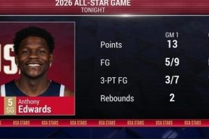 體育資訊2月16日訊 NBA全明星正賽循環(huán)賽2場戰(zhàn)罷,美國新星隊目前1勝1負(fù)。